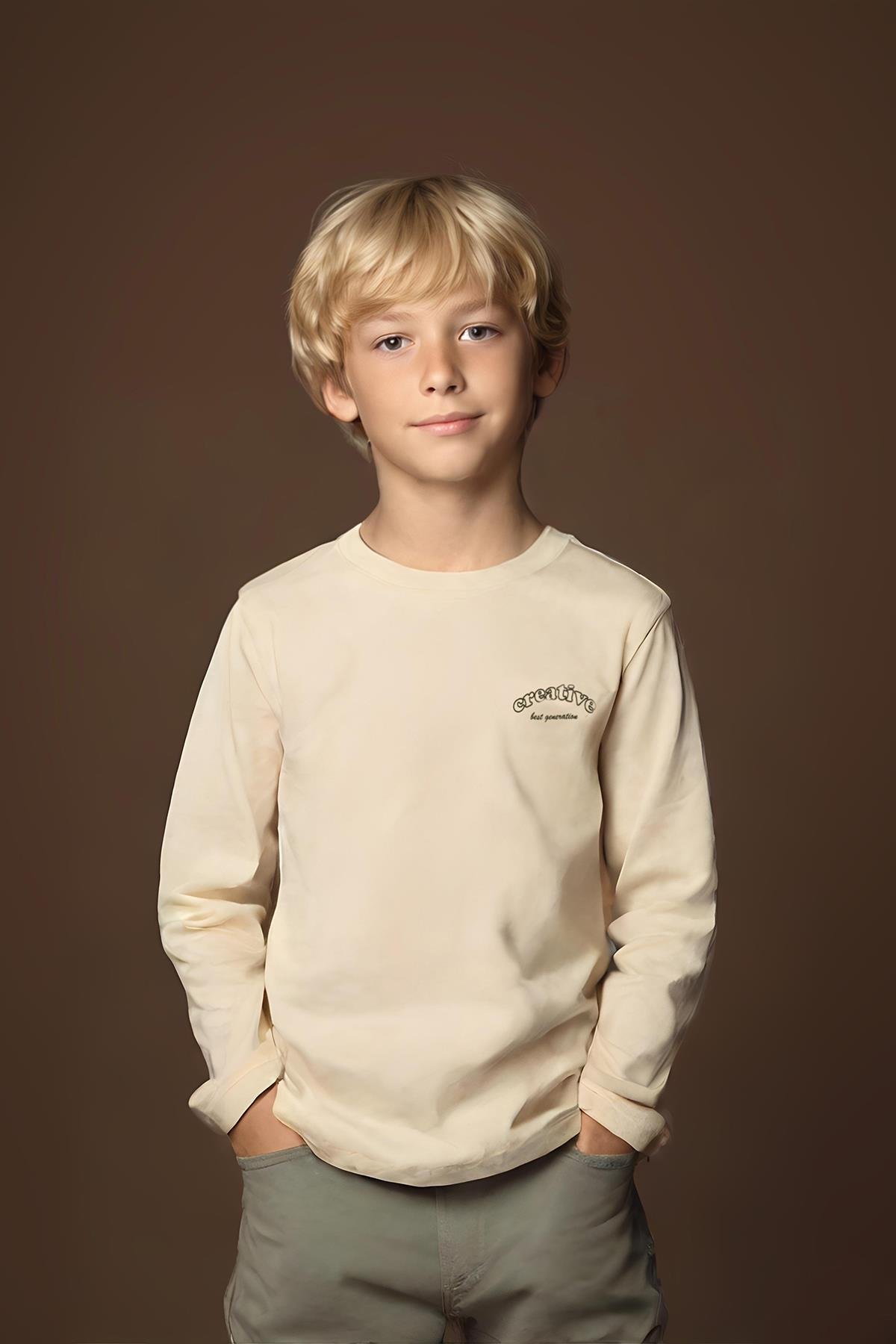 Bisiklet Yaka Uzun Kollu Ekru Erkek Çocuk Tişört, sade ve şık tasarımıyla erkek çocuklarının gardırobunda olması gereken temel parçalardan biri. %100 pamuk kumaşı sayesinde yumuşak dokusu ile gün boyu konfor sunar. Nefes alabilen yapısı ve rahat kesimi sayesinde çocukların hareket özgürlüğünü destekler.