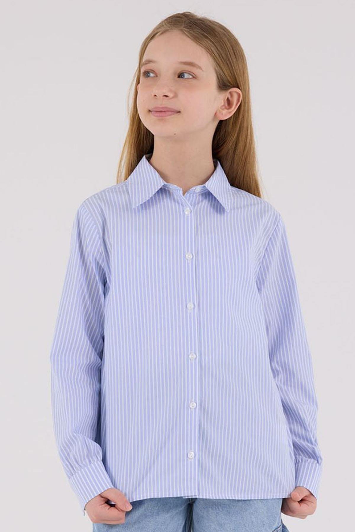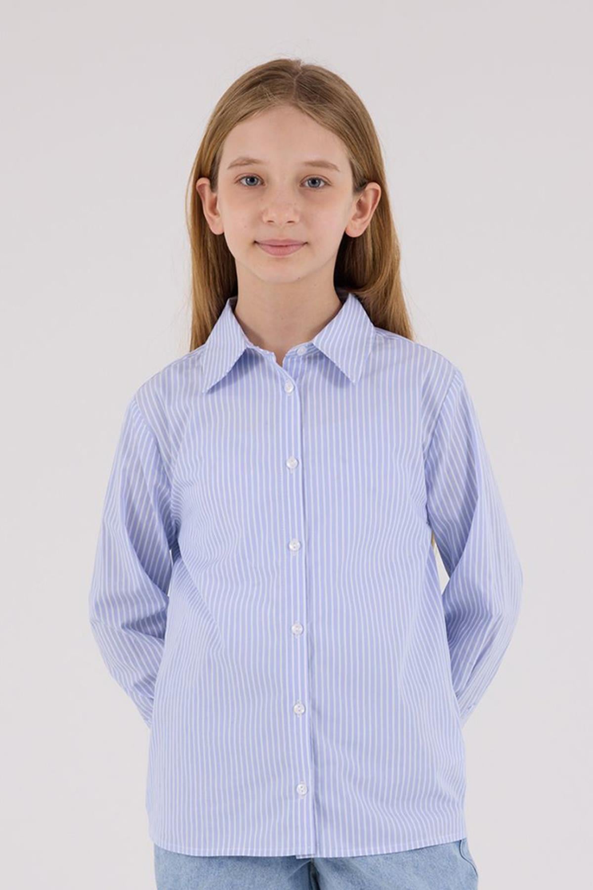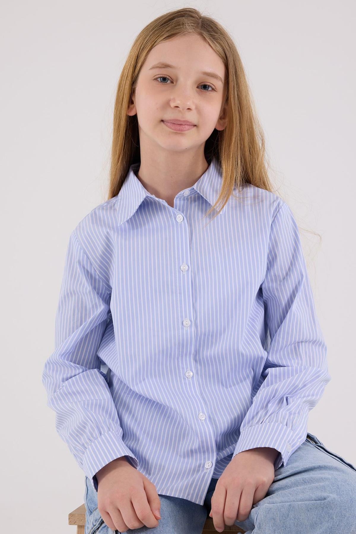 Kız Çocuk Poplin Uzun Kollu Mavi Çizgili Gömlek (MJ24007)
