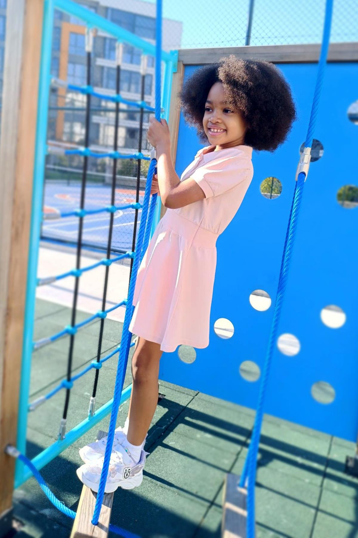Pembe rengiyle öne çıkan bu elbise, çocuğunuzun tarzını yansıtan zarif bir seçenektir.