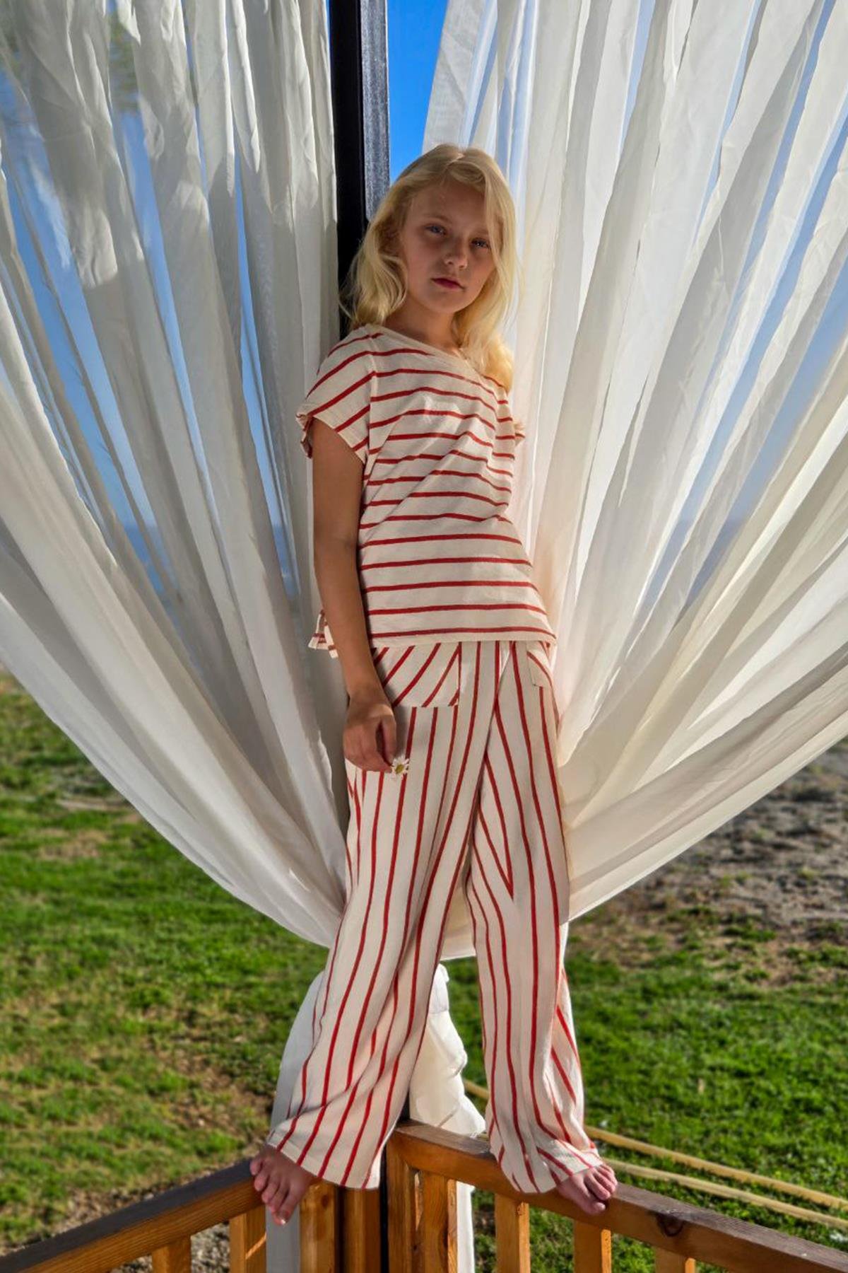 Kız çocukları için özel olarak tasarlanmış Lıso & Lıva Kırmızı Çizgili Takımı, 7-12 yaş aralığındaki küçük hanımların gardırobuna şıklık ve konfor katacak mükemmel bir kombin sunar.